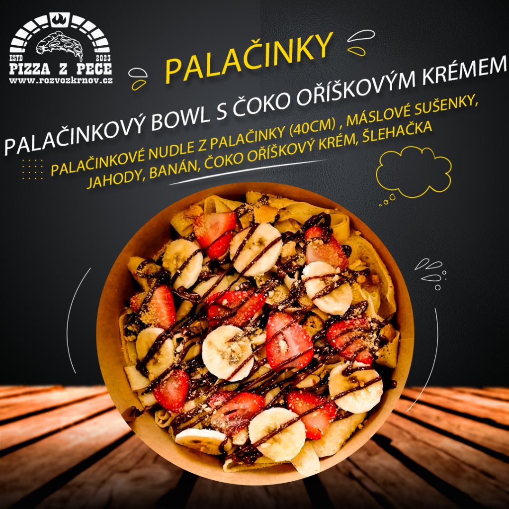 PALAČINKOVÉ NUDLE CCA 200G , MÁSLOVÉ SUŠENKY, JAHODY, BANÁN, ČOKO OŘÍŠKOVÝ KRÉM, ŠLEHAČKA