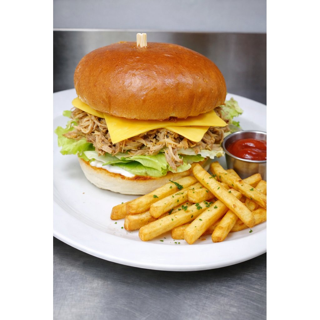 - Naše trhané vepřové maso okurková mayo, ledový salát, křupavá cibulka, cheddar, trochu jalapeno papriček, bbq omáčka, máslová brioška + varianta malé hranolky + dip