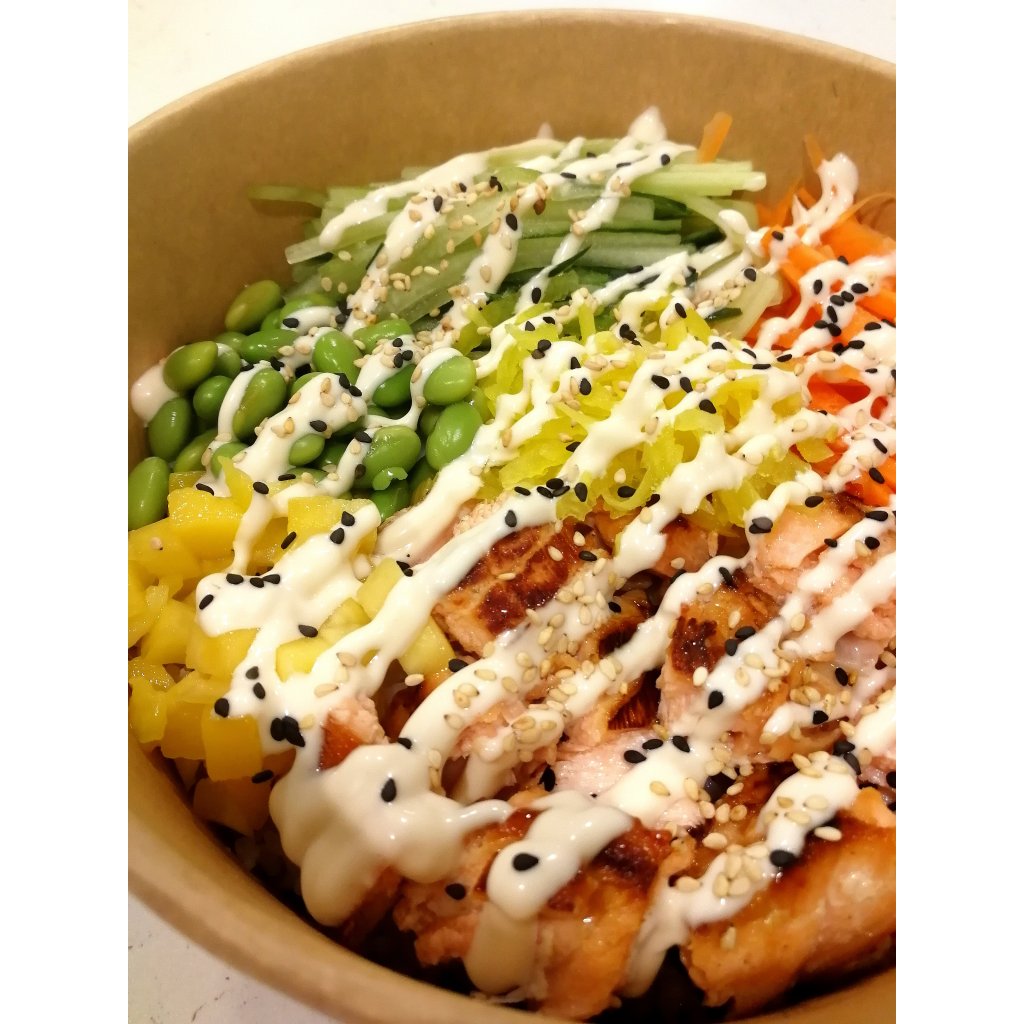 - sushi rýže, marinovaný grilovaný Norský losos, edamame fazole, takuan ředkev, mango, okurka, mrkev, sezam a naše medová majonéza
