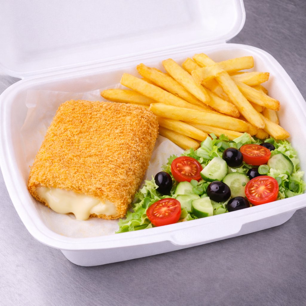 Hranolky, gouda v panko strouhance, DIP Tatarka, zeleninový salát
