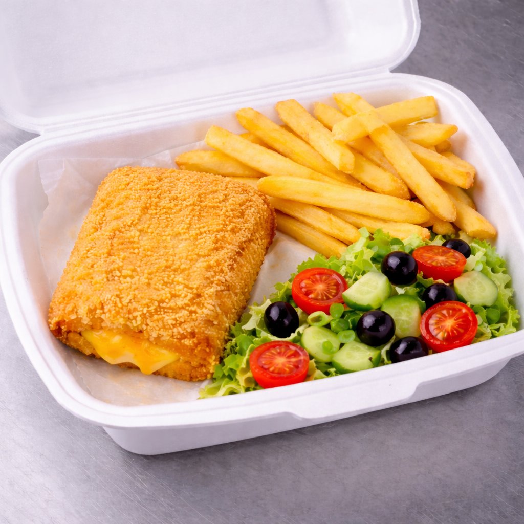 Hranolky, cheddar v panko strouhance, DIP Tatarka, zeleninový salát