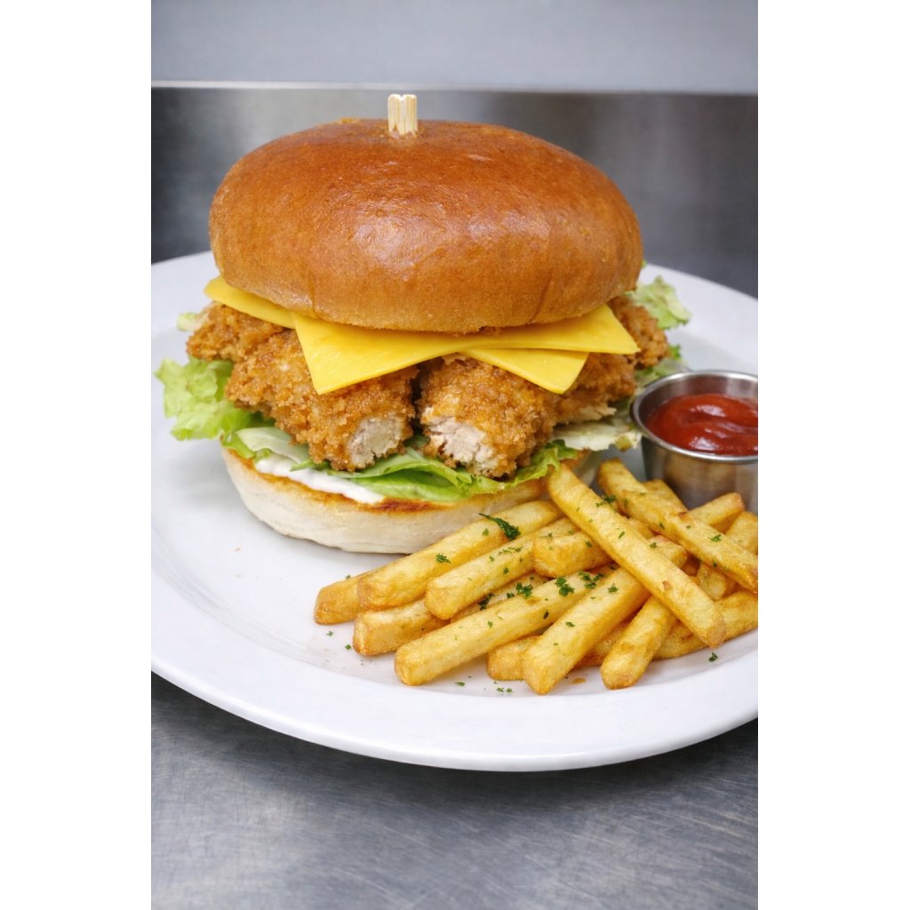 Kuřecí stripsy, cheddar, ledový salát, nakládaná okurka, medovo hořčičná omáčka, vše v máslové briošce + malé hranolky + DIP tatarka