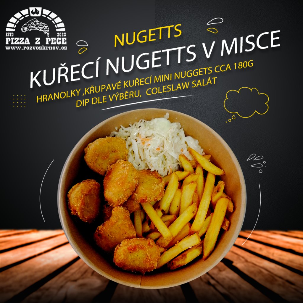 - Kuřecí nugetts, hranolky, coleslaw salát + DIP tatarka
